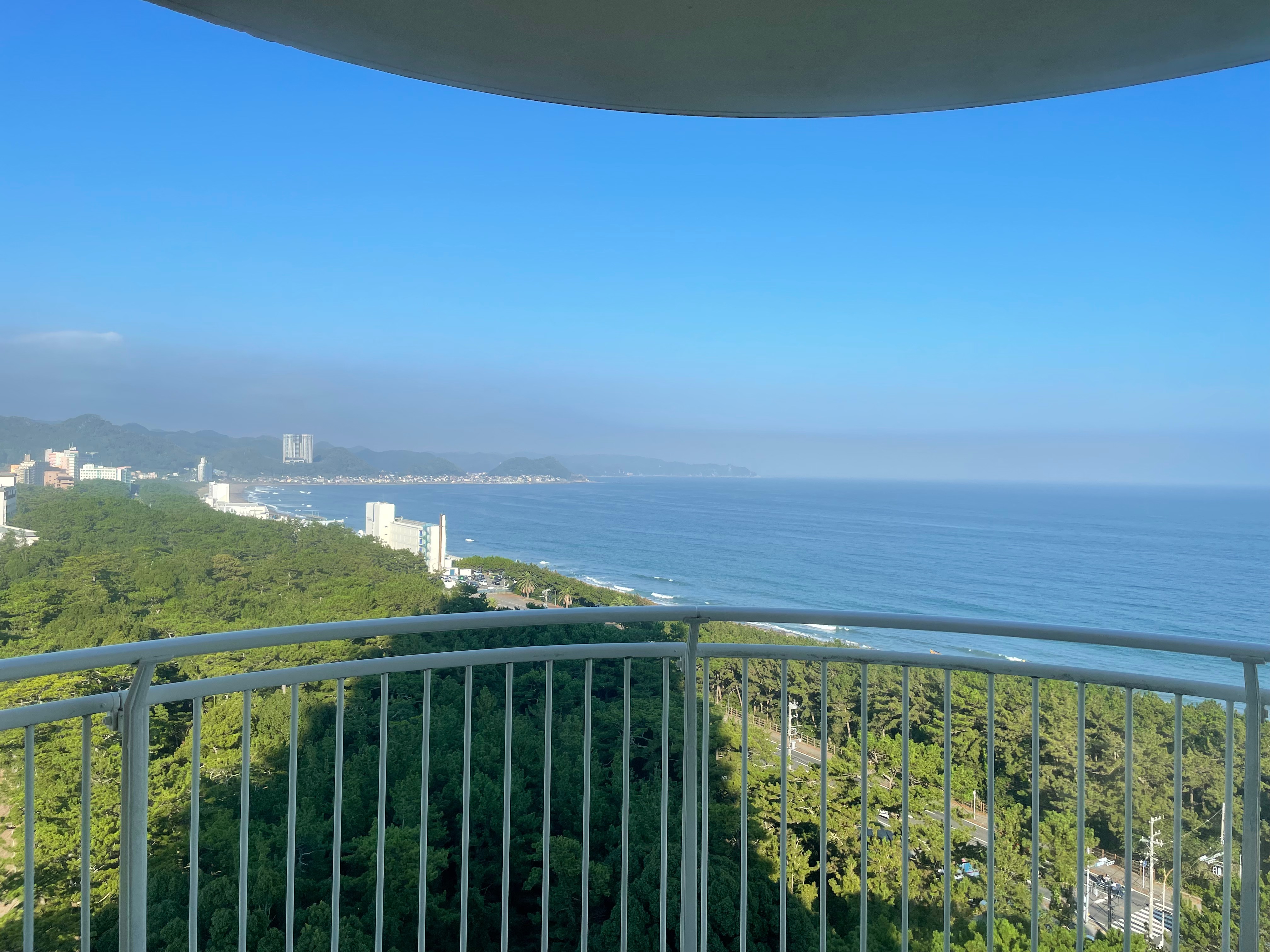 今回は洗濯したのですが、乾燥機が新しくなっていて快適でした。朝焼けと夕焼けが両方楽しむことができ、松林の向こうに広い海と砕ける白波まで見ることができる景色はグランドタワーならではのもの。グランドホテルのお風呂を使えるのもいいですね。